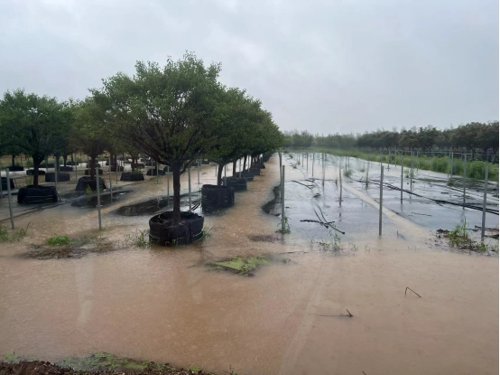 產(chǎn)業(yè)園內(nèi)排水渠道堵塞,多處林下區(qū)域積水,不同程度內(nèi)澇面積約有100多畝,在接到值班人員通知后,森態(tài)怡景黨支部帶領(lǐng)應(yīng)急小隊(duì)迅速趕赴現(xiàn)場(chǎng),疏通堵塞排灌溝渠的淤泥、垃圾,再使用汽油抽水機(jī)對(duì)排灌溝渠進(jìn)行導(dǎo)流,確保基地內(nèi)的漬水迅速排掉,縮短苗木被浸泡的時(shí)間,減輕漬澇危害。林下積水無法使用機(jī)械設(shè)施排出,應(yīng)急小隊(duì)采用鐵鍬進(jìn)行手動(dòng)排水、清理地表渣屑,并將被大風(fēng)吹倒的幼苗進(jìn)行扶苗、沖洗葉片上的泥漿,以恢復(fù)植株的正常生長,根部松動(dòng)的、根系外露的苗木及時(shí)培土覆蓋,用力壓實(shí)。經(jīng)過數(shù)個(gè)小時(shí)努力,基地現(xiàn)階段的積水已基本排完。